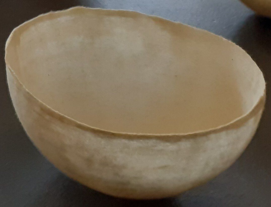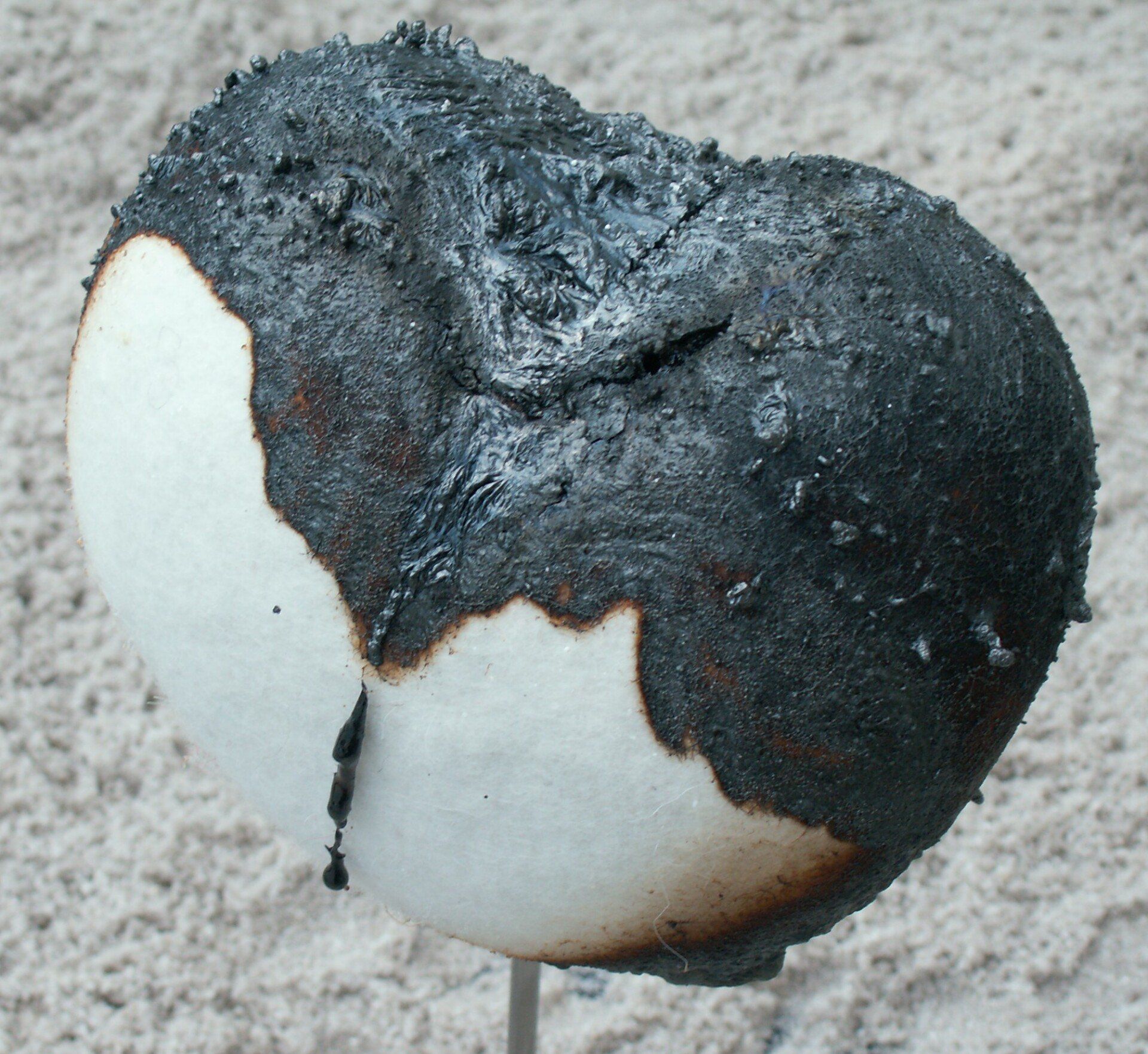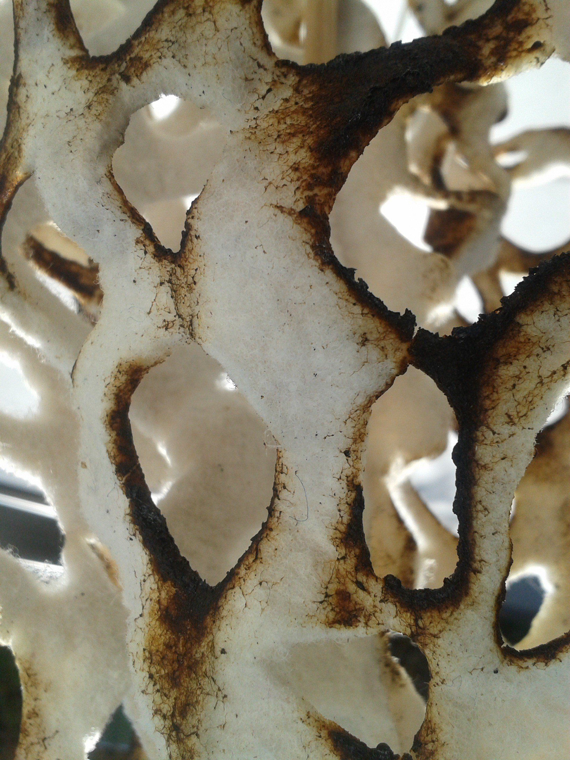 Die sich dadurch verändernde Oberflächenstruktur, verbunden mit den angesengten Rändern vermittelt einen figurativen Eindruck, vergleichbar mit einem Fragment.