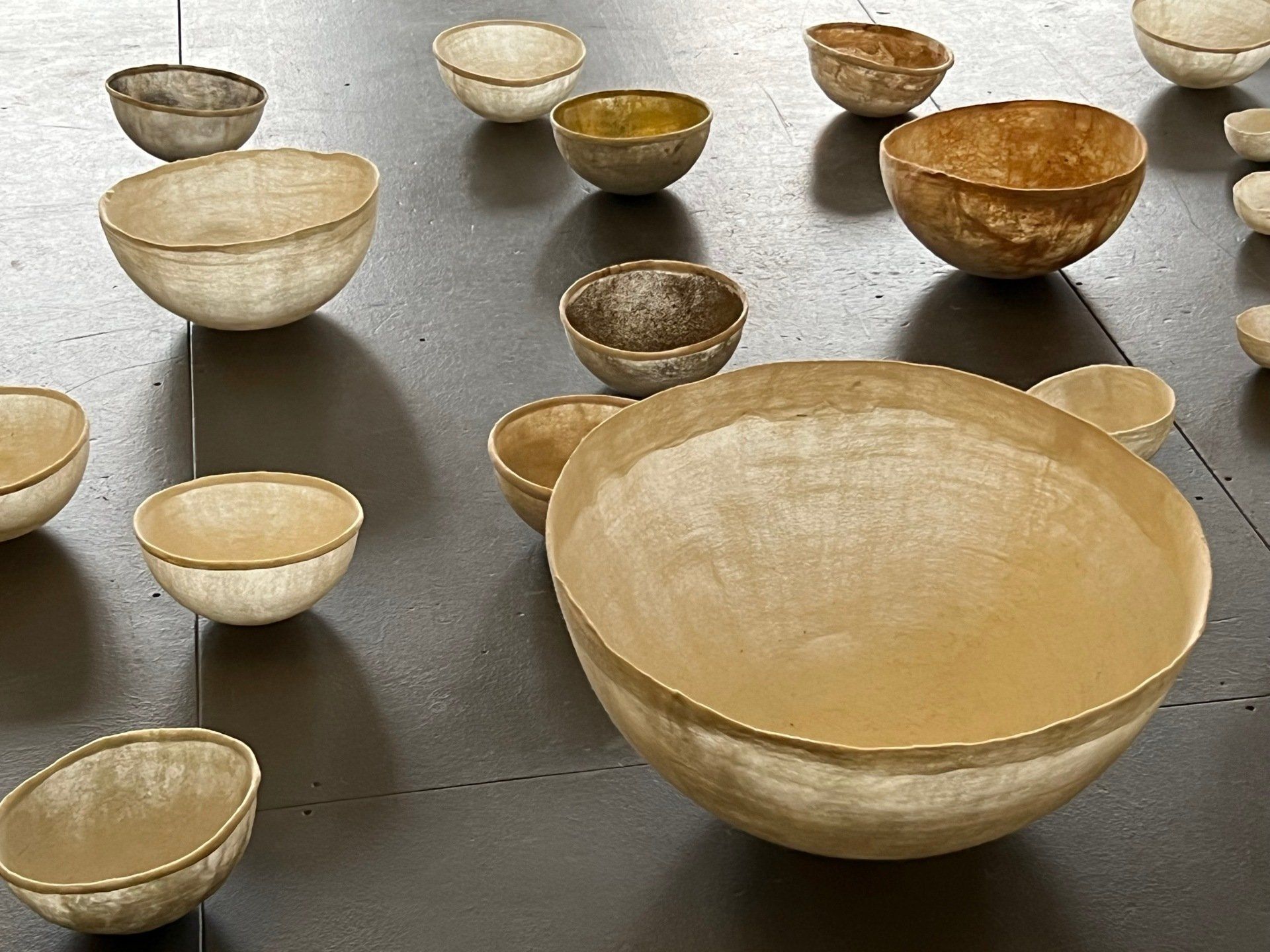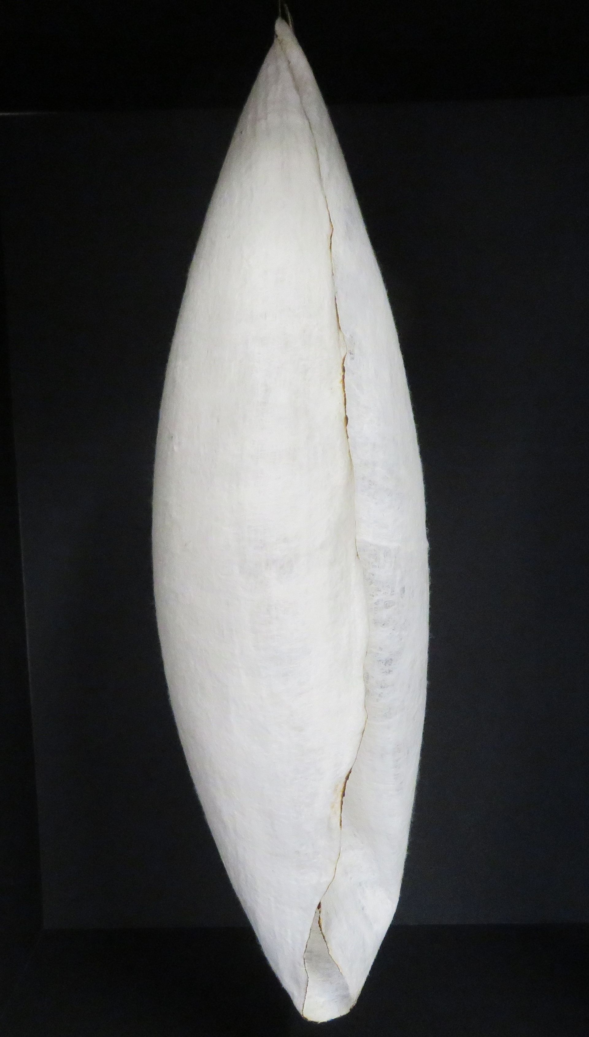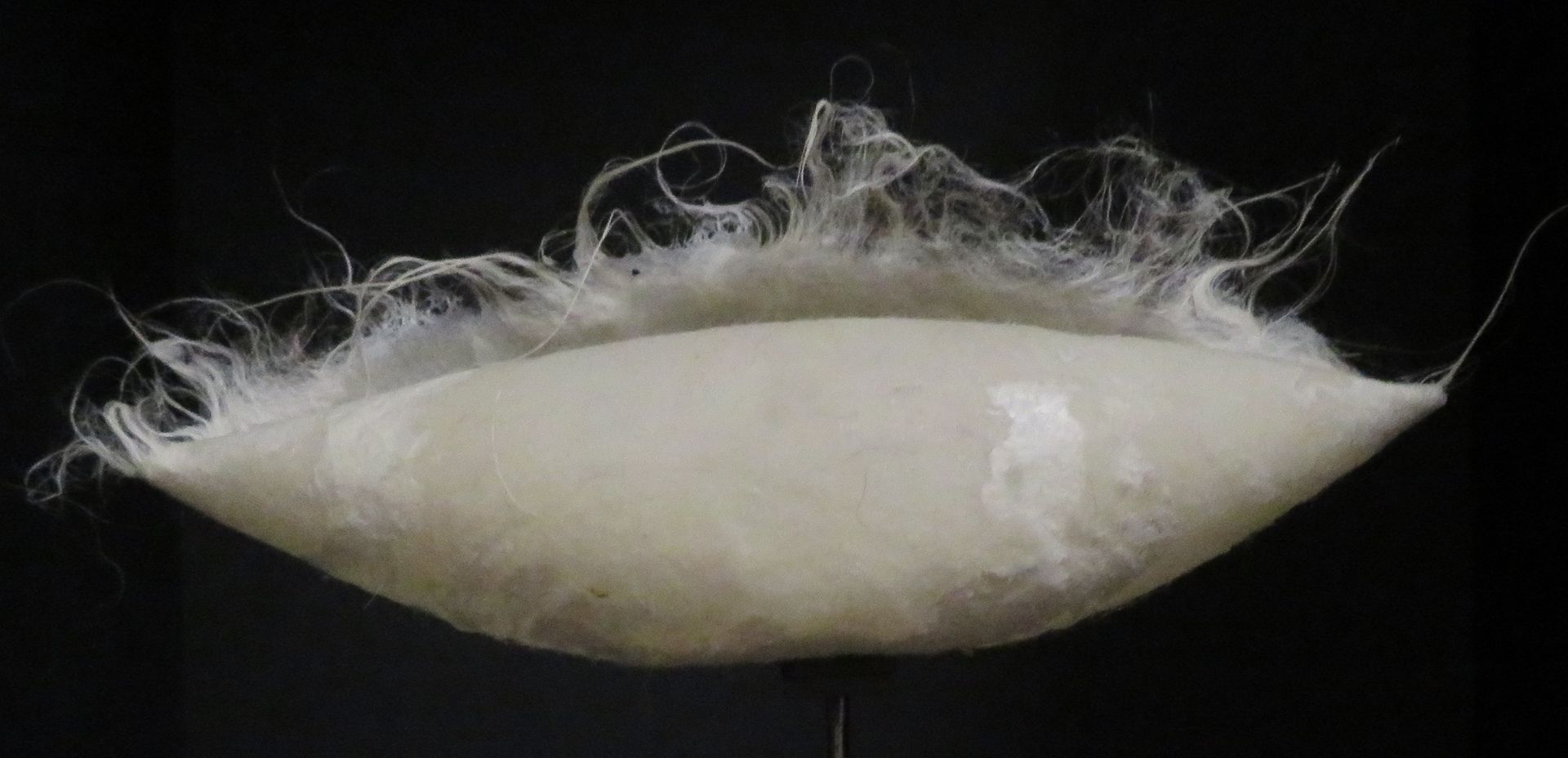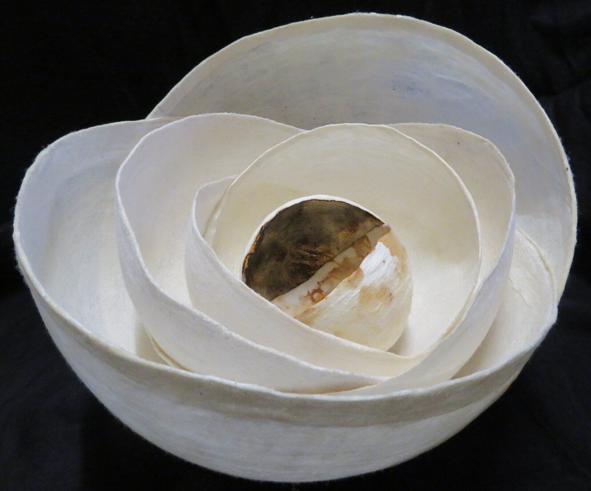 Ähnlich wie Papier wird eine Fläche aus feinem Filz wird durch Falten strukturiert. Verschlingen, ineinander stecken und wieder auffächern bricht die Strenge und Monotonie der Ausgangsstrukturierung, die dennoch erkennbar bleibt.
