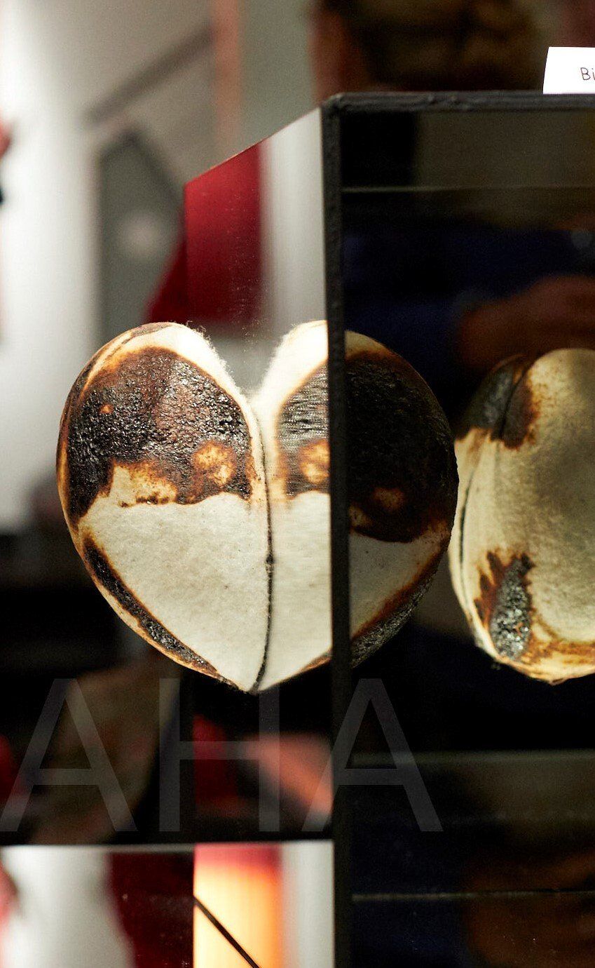 Durch die Anordnung der Spiegel sind die geteilten angebrannten Herzen spiegelbildlich